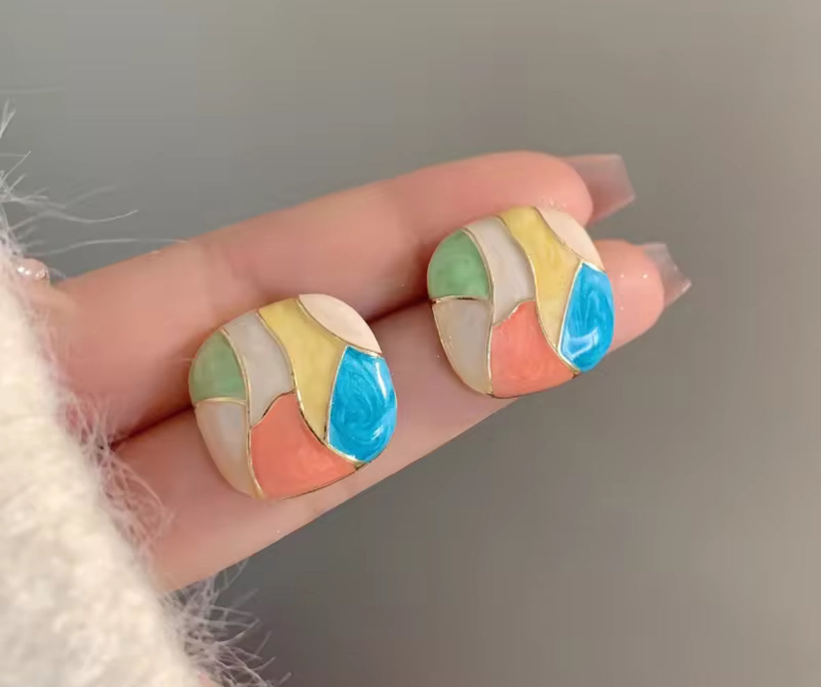 Make a bold, artistic statement with these Colorful Mosaic Statement Earrings. Featuring a unique blend of textured enamel in vibrant shades of blue, pink, green, yellow, and white, these abstract geometric studs are inspired by stained glass art and modern design.