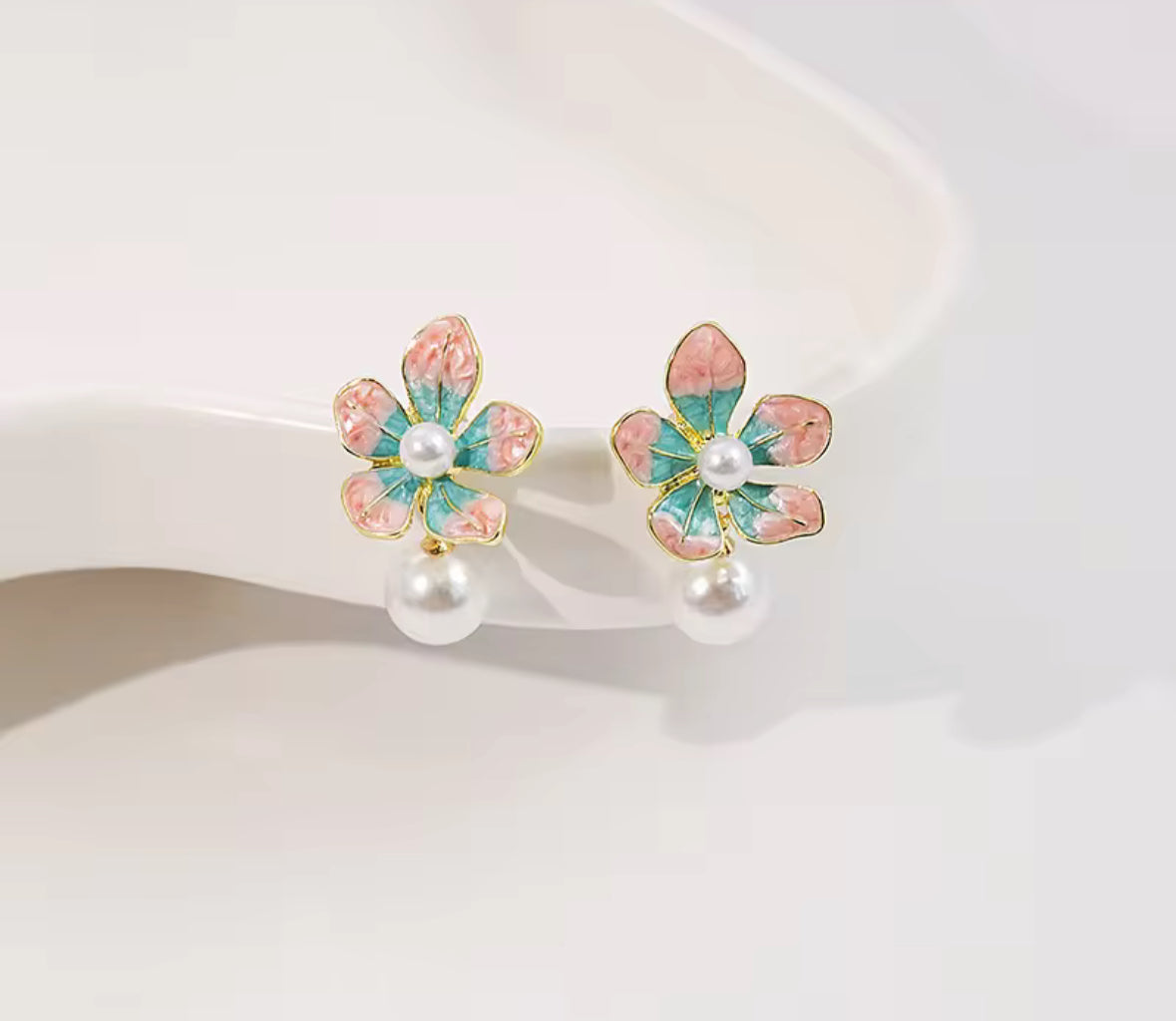 Iridescent Flower & Pearl Drop Earrings – Elegant Petal Studs for Women