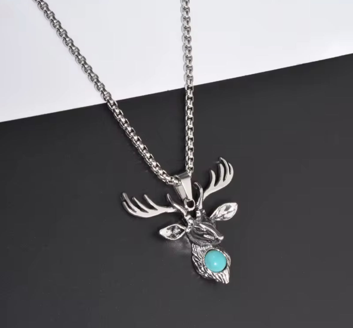 This Deer Head Pendant Necklace captures bold elegance and natural power, featuring a finely detailed stag head design with a striking turquoise-blue stone centerpiece. Made from premium stainless steel, it resists tarnish and maintains its shine, making it perfect for everyday wear or as a standout statement piece.
