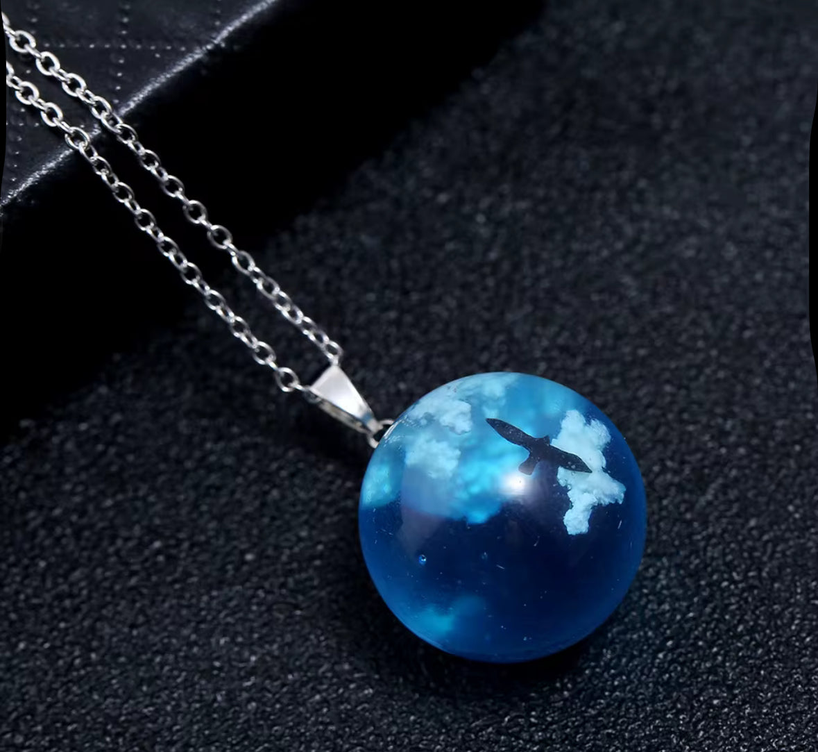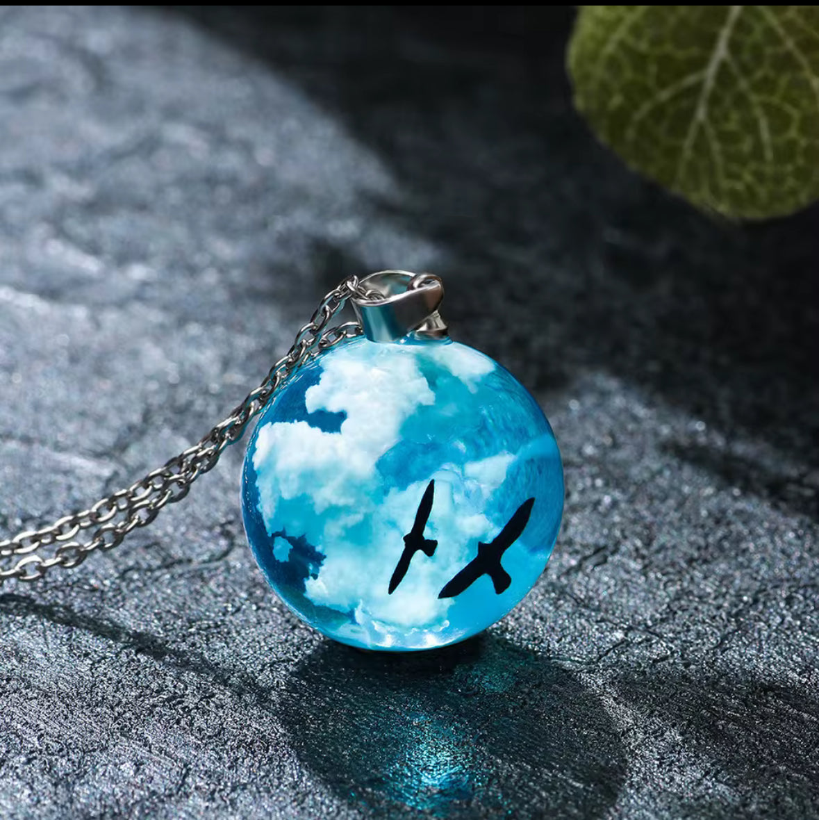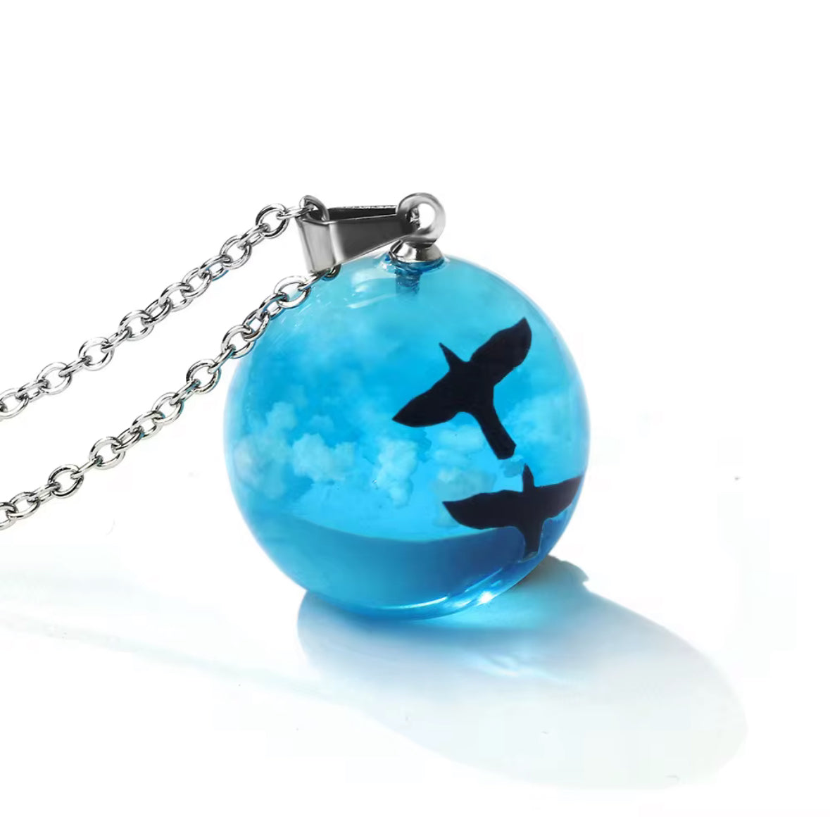 This stunning Ocean Blue Glass Pendant Necklace captures the essence of the sky and sea in a crystal-clear globe, featuring a floating design that mirrors clouds and soaring birds. Perfect for those who love nature, minimalism, and unique statement jewelry.