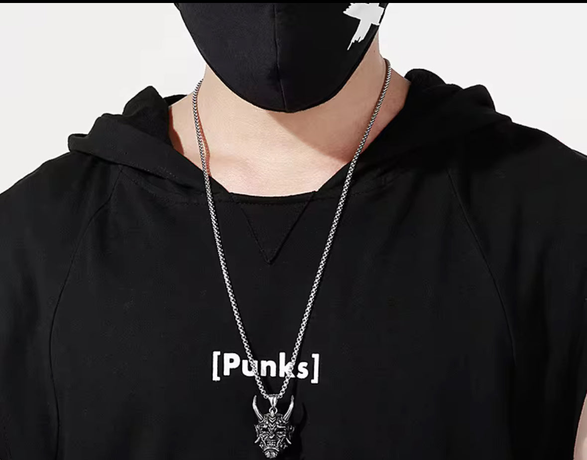 Channel the fierce spirit of ancient Japanese warriors with this Oni Demon Mask Pendant Necklace, a bold symbol of strength, rebellion, and protection. Inspired by traditional Samurai folklore and Japanese Oni demons, this finely crafted pendant is forged from high-grade stainless steel and features a menacing horned mask with sharp detailing and a solid, masculine chain.