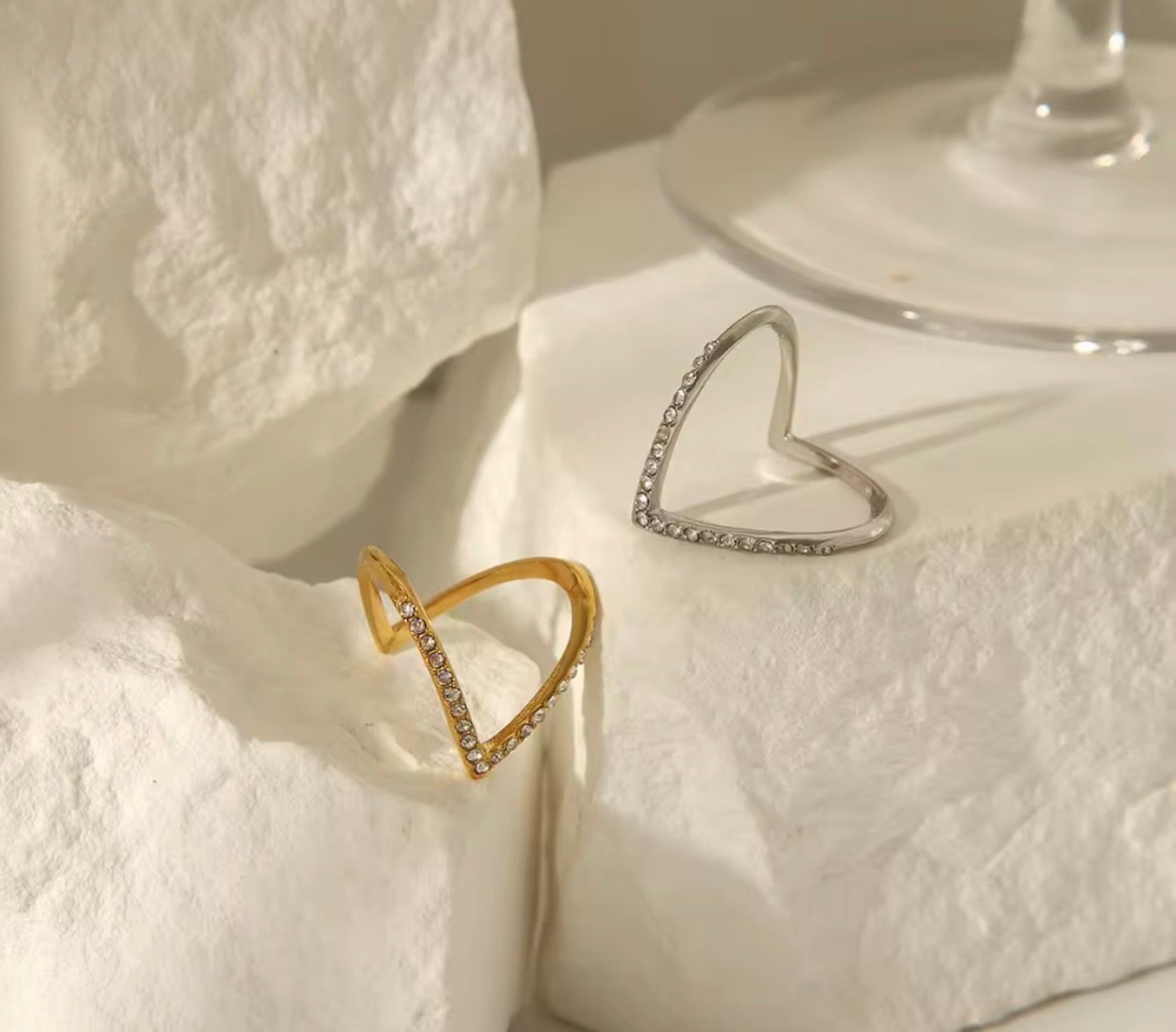 The sleek chevron silhouette enhances the natural shape of your fingers, while the row of sparkling cubic zirconia stones delivers a refined, diamond-like brilliance. Crafted with high-quality gold plating over a durable alloy base, this ring offers both style and comfort.